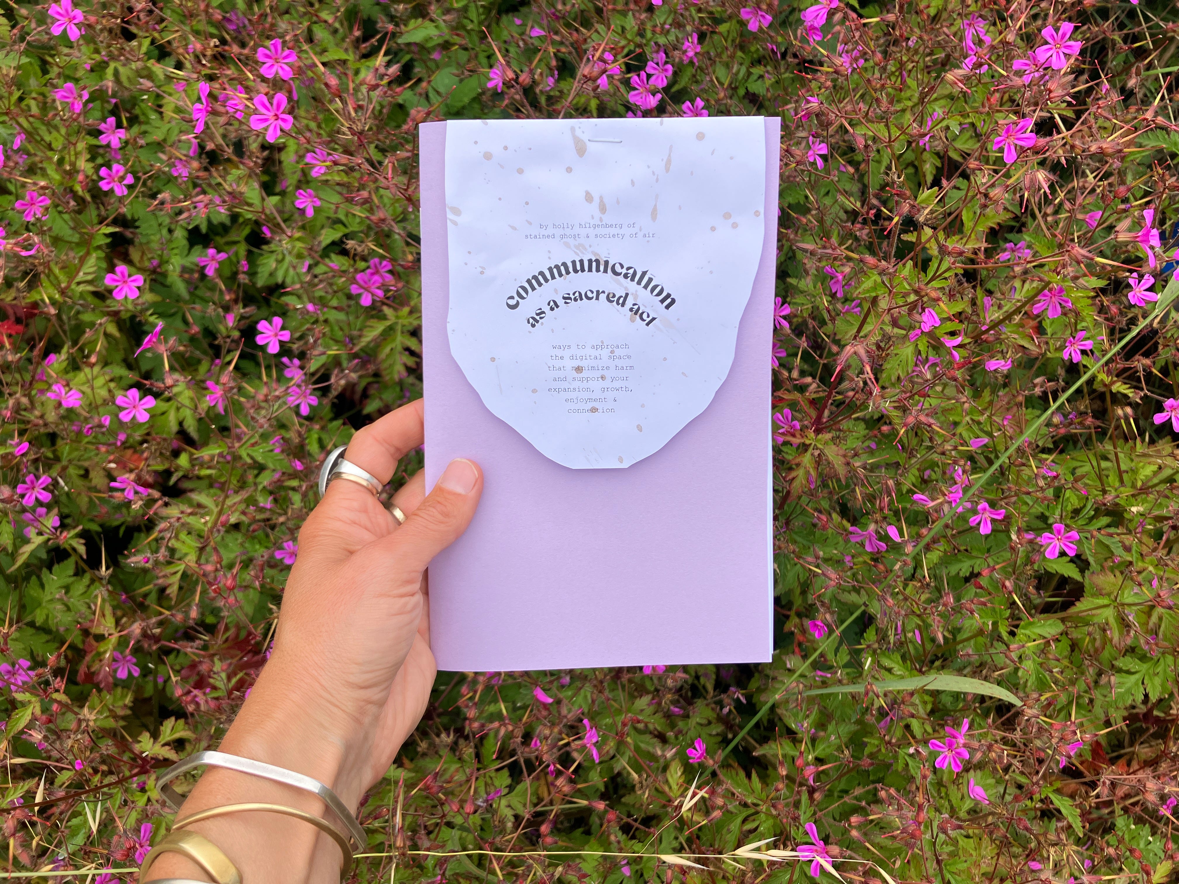 pictured above: a photo of the cover of communication as a sacred act, a zine exploring ways to approach the digital space that minimize harm and support your expansion, growth, enjoyment & connection